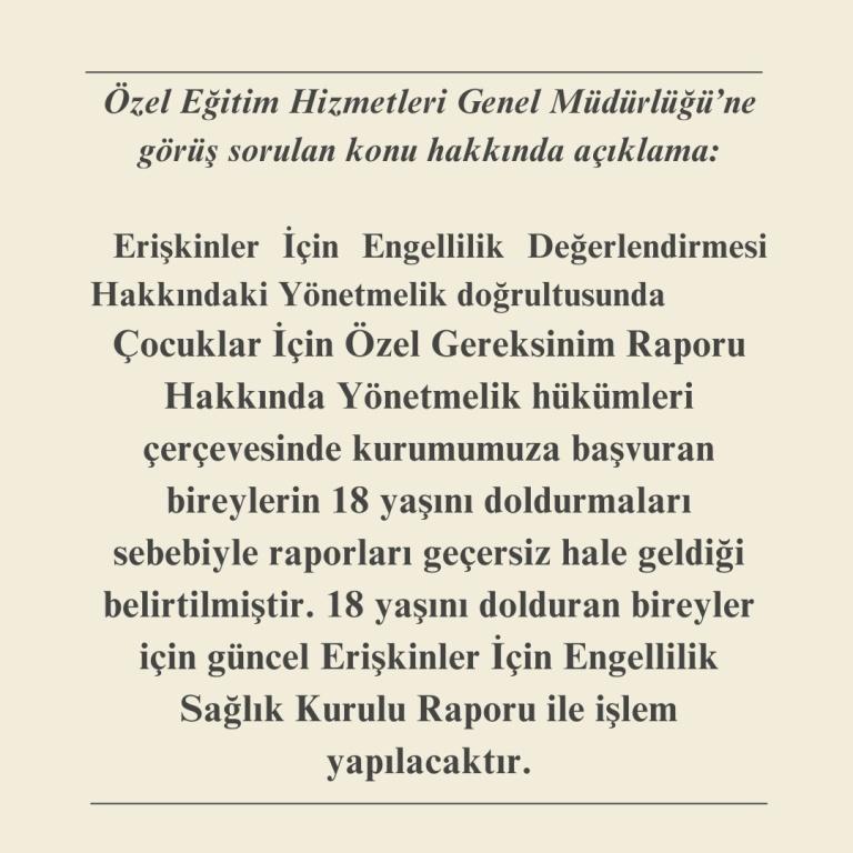 18 Yaşını Dolduran Bireyler Erişkinler İçin Engellik Sağlık Raporuyla İşlem Yapılacaktır.